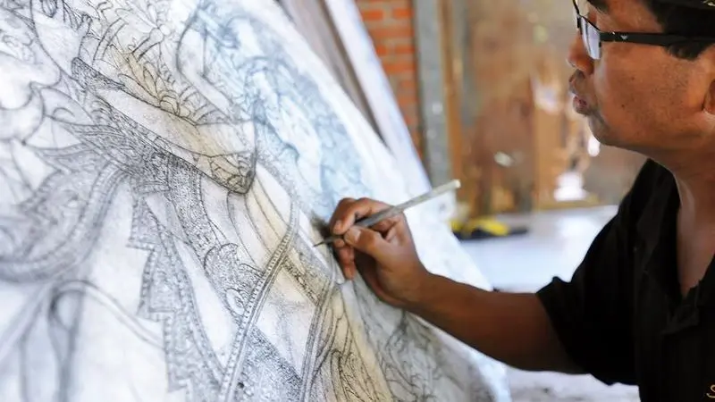 What sets Batuan apart is its signature painting style. These works are intensely detailed, monochromatic at times, and often depict dense narratives from Hindu epics or Balinese folklore. At first glance, one might feel overwhelmed—layers upon layers of figures, creatures, and symbols crowd the canvas. Yet, with each moment of observation, a new detail reveals itself. It’s visual meditation. The subtle darkness in tone evokes both reverence and curiosity.